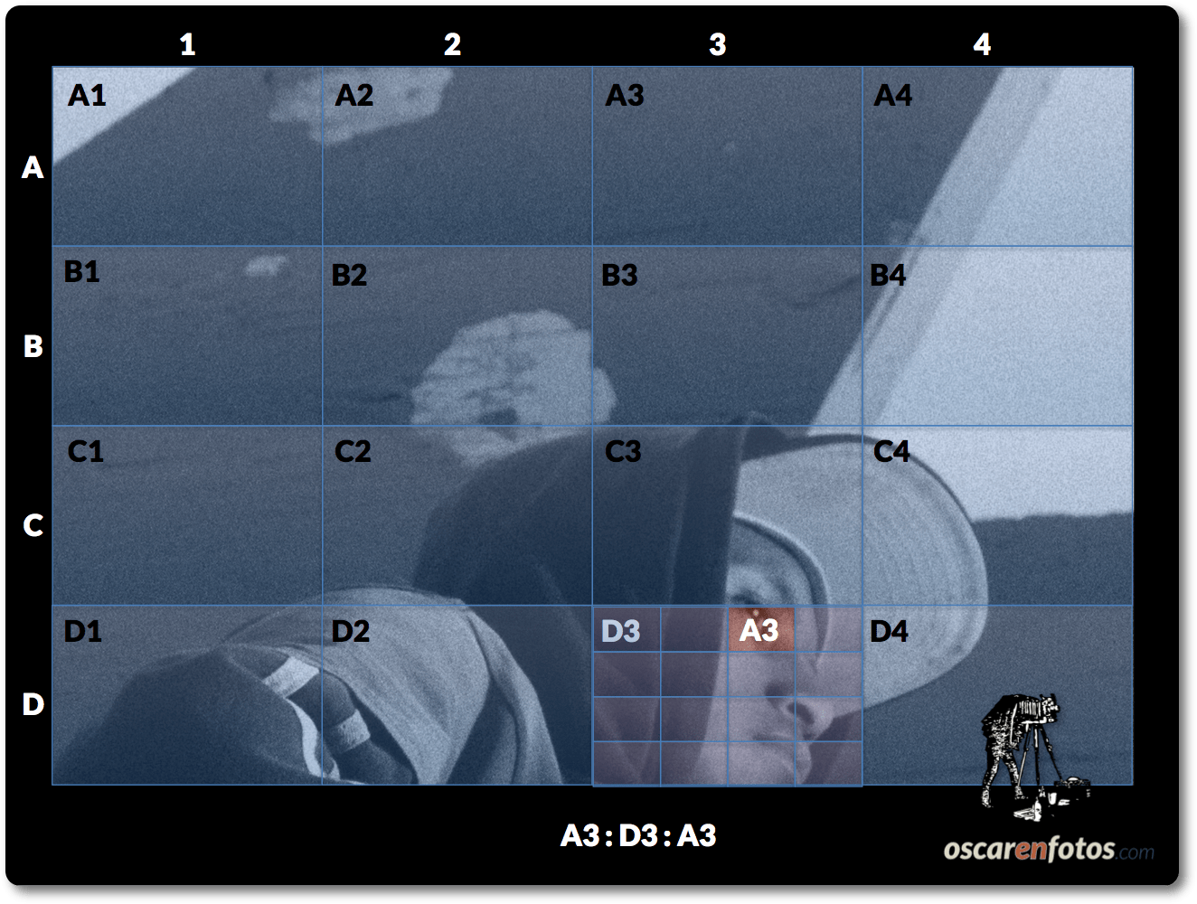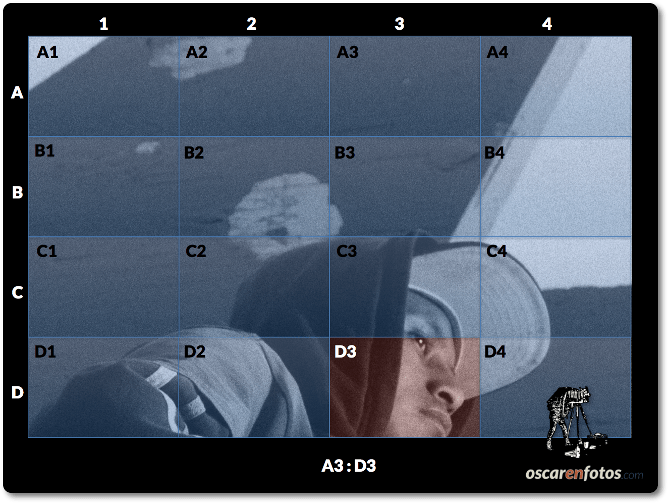 Este sistema de notación modular permite identificar zonas concretas de la foto haciendo referencia al módulo correspondiente. En el ejemplo anterior, si queremos decir «la cara del sujeto está arriba a la derecha un poco centrada» resultaría impreciso. Usando el sistema de notación de módulos que propongo se diría «la cara del sujeto se encuentra en A3″, una localización mucho más específica.