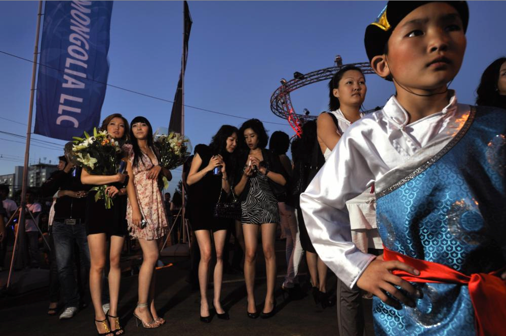 © Mark Leong. A traditional child acrobat stands before a line of fashion models at a boy-band pop concert sponsored by the formerly Soviet-run APU vodka factory. In Ulaanbaatar, the abrupt societal shift makes for plenty of scenes of collision between the centuries-old and the brand new.