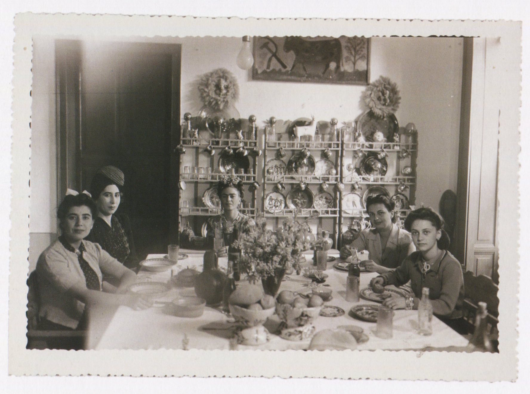 El-Album-de-Frida-Kahlo-coleccion-Vicente-Wolf-57 mayo 21, 2016 1776 × 1321 El álbum de Frida Kahlo Fotógrafo no identificado. De izquierda a derecha: Fotógrafo desconocido. Guadalupe Marín Rivera, amiga no identificada, Frida Kahlo, Cristina Kahlo, Isolda hija de Cristina Kahlo. Comedor de la Casa Azul (1942)