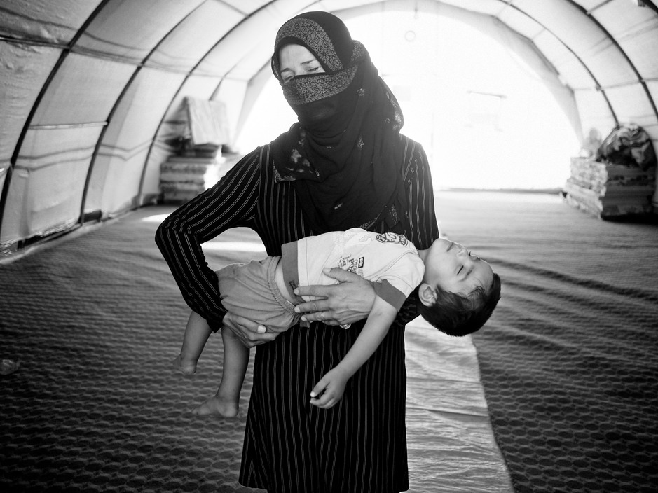 Dohuk, Iraqi Kurdistan. 29 July, 2013. A mother holds her sick child suffering from diarreah and vomiting inside a tent housing new arrivals at the Domiz camp for Syrian refugees. About 50.000 Syrian refugees, mainly from the Kurdish regions inside Syria, live at this camp.